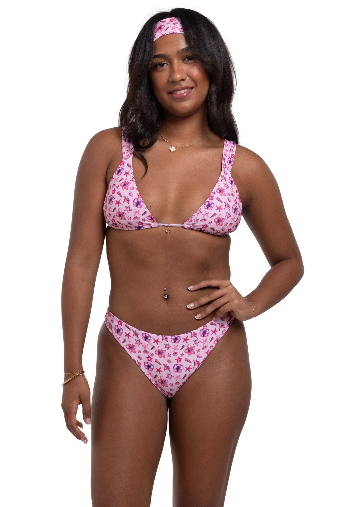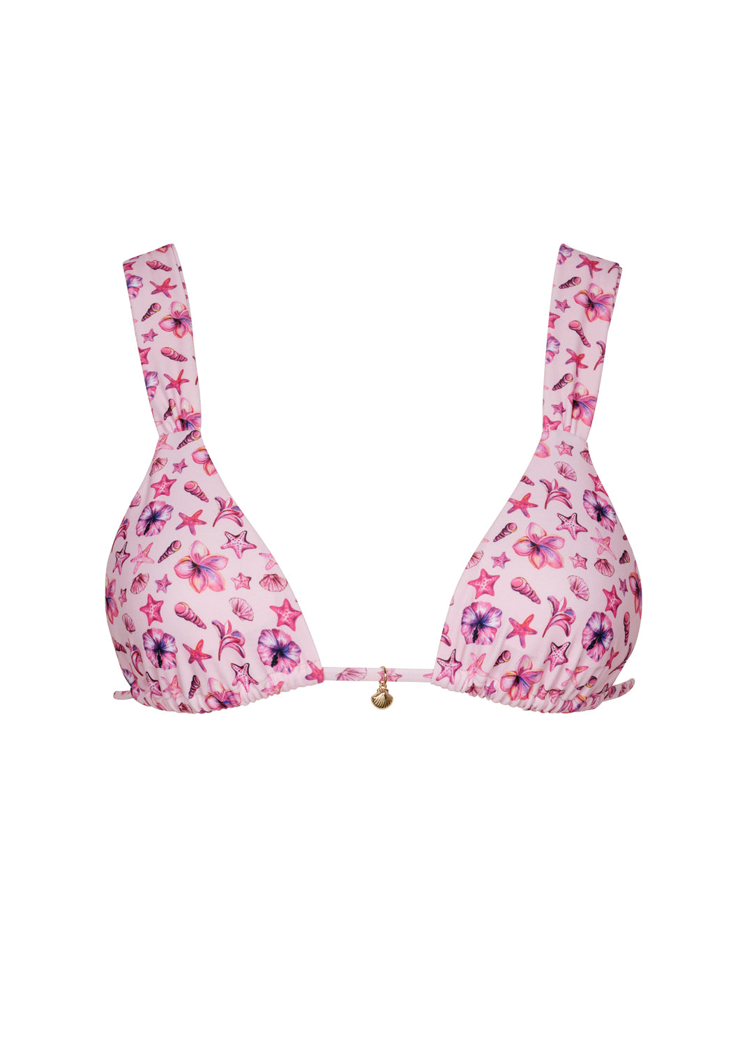 Our timeless triangle bikini top features adjustable straps for the perfect fit, whether you're swimming or soaking up the sun. It also features an adorable shell detail that adds a playful, beachy touch to complete the look.